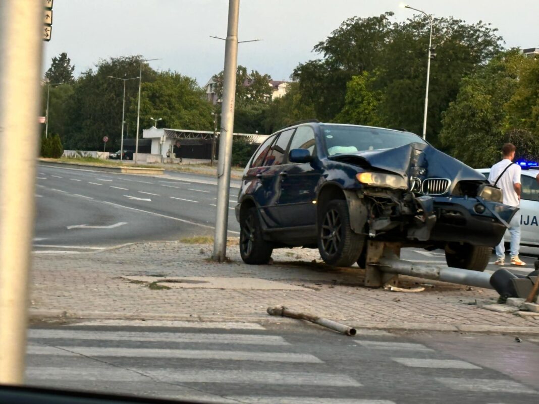 Голем автомобил БМВ утрово удрил во знак за сигнализација на крстосница во населбата Аеродром.