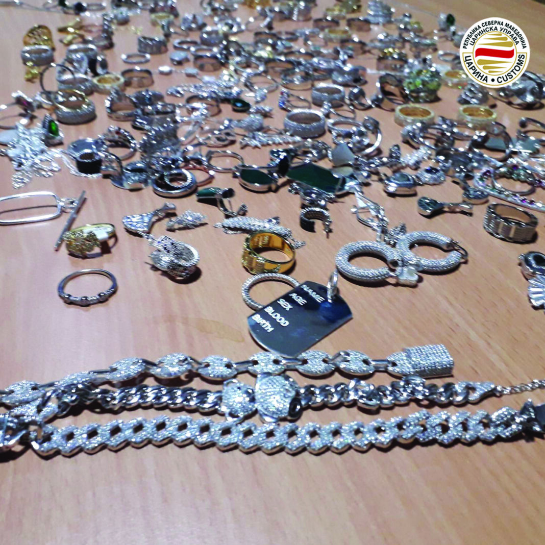 Станува збор за 157 парчиња прстени, 21 парчиња нараквици, 45 ланчиња, 26 обетки и 20 привезоци кои лицето ги скрило во ќеса која ја ставил зад задното седиште и во еден куфер ставен во багажниот простор.