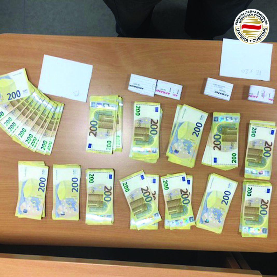 „Запленети се 50.600 евра коишто патник на влез во државата на царинската испостава Аеродром Скопје не ги пријавил кај царинските службеници. Патникот кој патувал од Истанбул на влез се определил да помине на зелен канал каде што поминуваат лица кои немаат ништо за пријавување. Царинските службеници го селектирале за преглед, при што во личниот багаж му биле пронајдени девизни средства во износ од 60.600 евра.