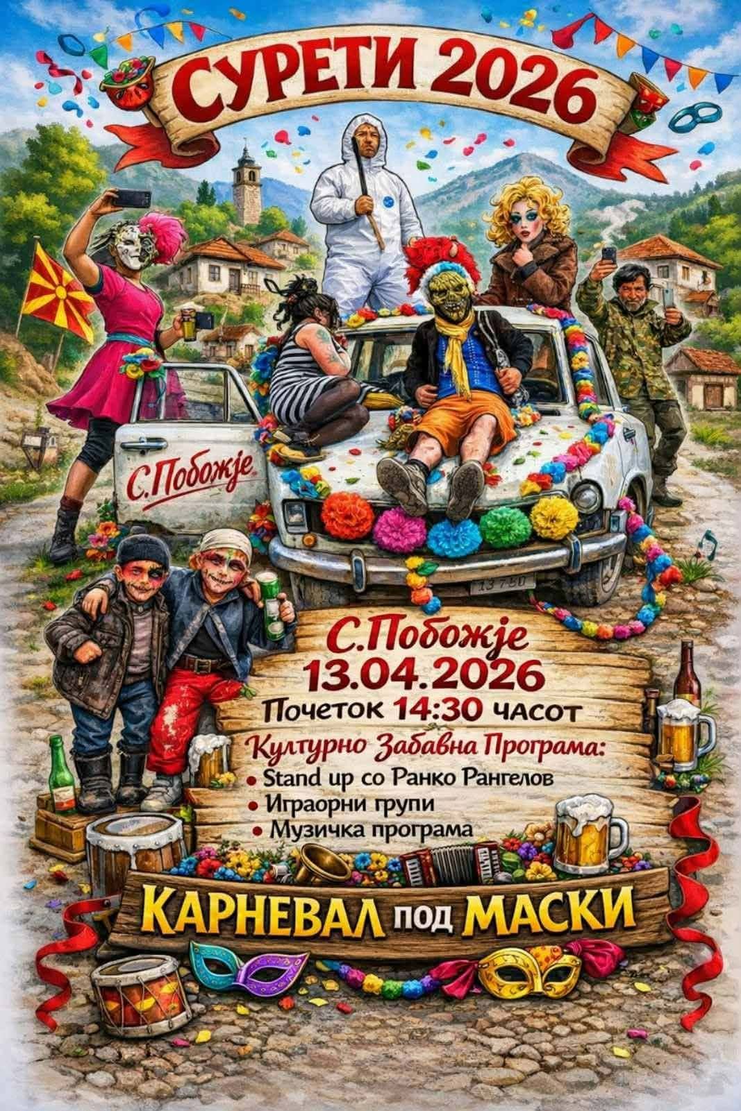 Карневал под маски Сурети се одржа вчера во скопското село Побожје, традиционално на втор ден Велигден. Сурети се народен обичај, маскенбал – дел од старите обредни поворки. Се изведува со маскирани луѓе, учесниците носат специфични носии и прават обредни игри. Целта е симболично да се избрка злото и да се донесе здравје и плодност. Овој обичај постои со векови и се практикува и во скопското село Побожје, каде Сурети е дел од традиционален карневал .