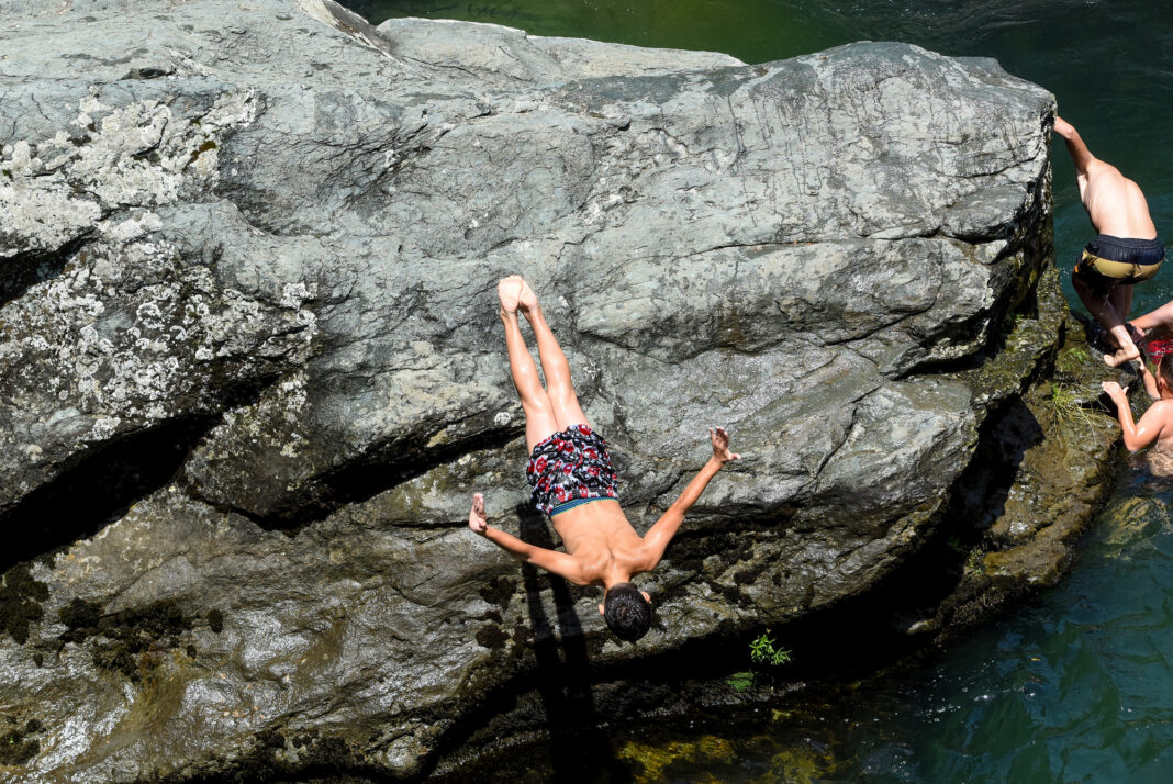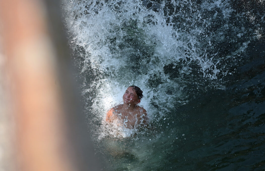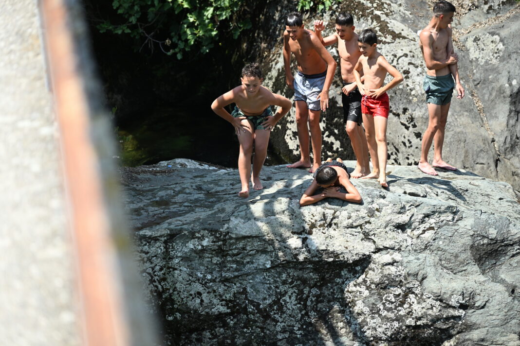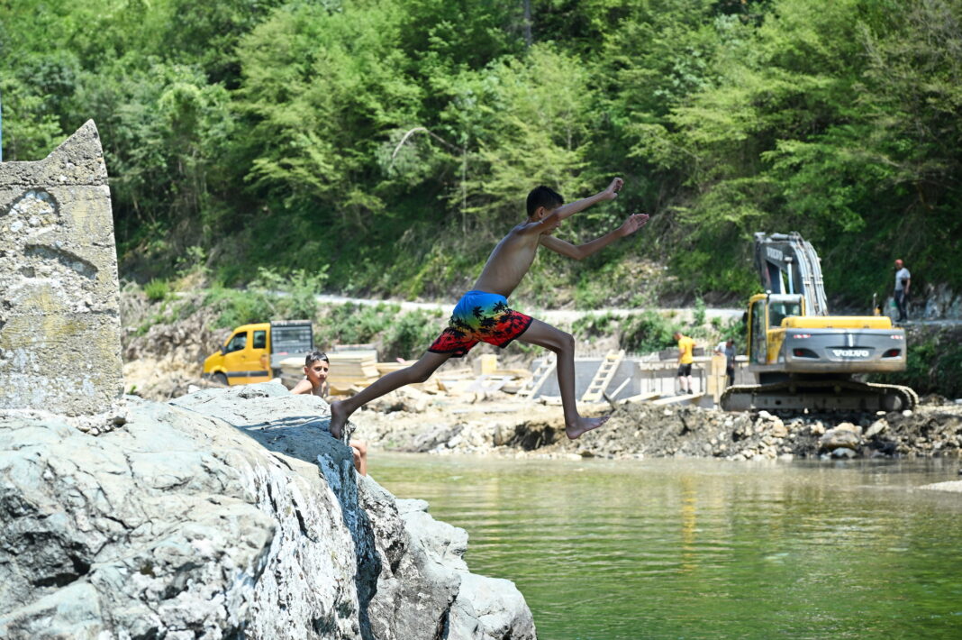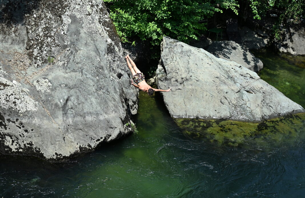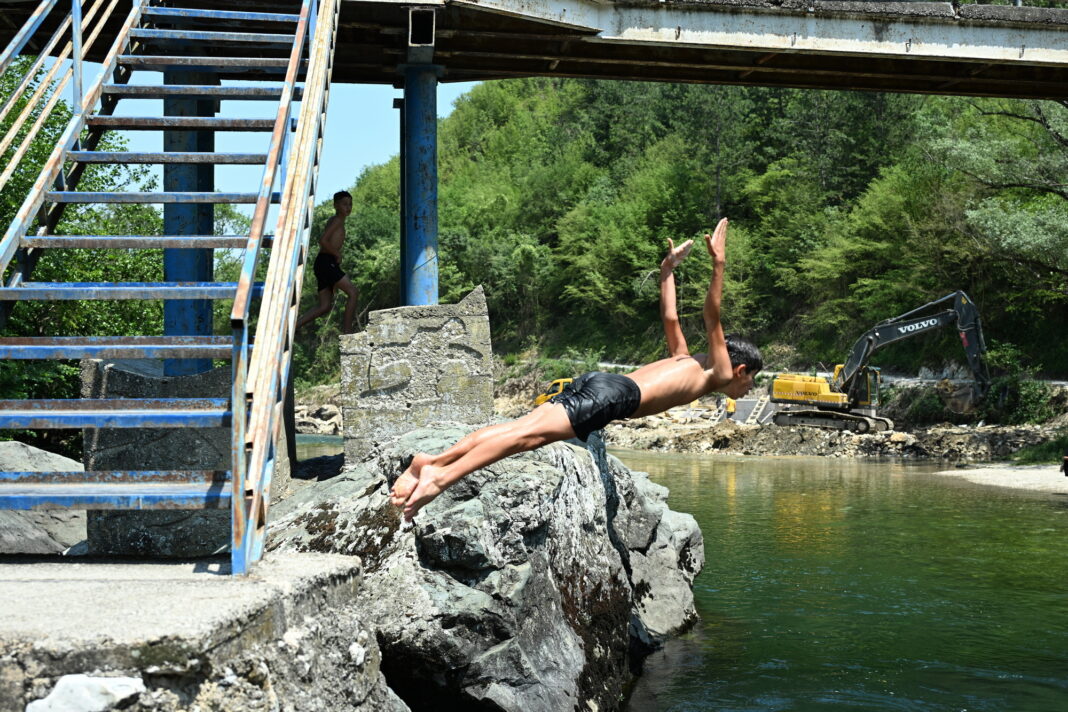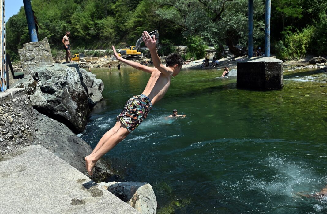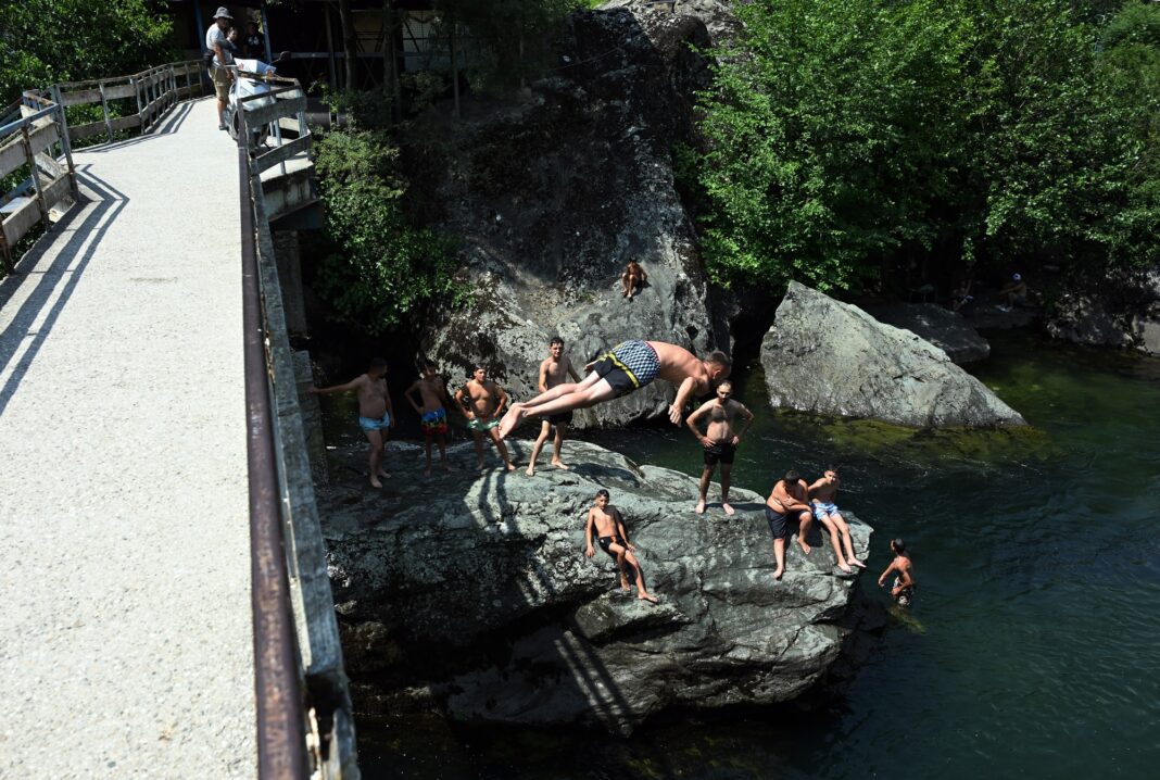 A boy jump to cool off in the river Treska near Skopje on July 13, 2023, as temperatures about 40 degree Celsius.