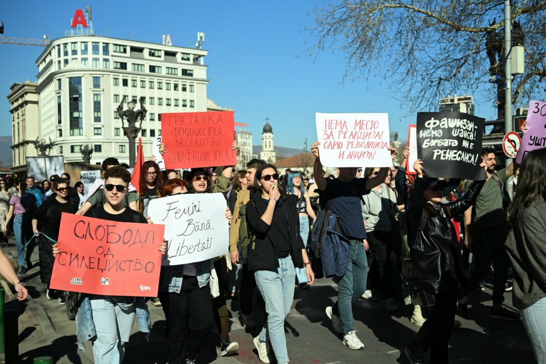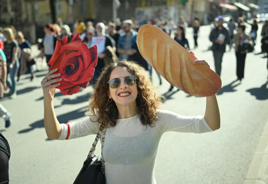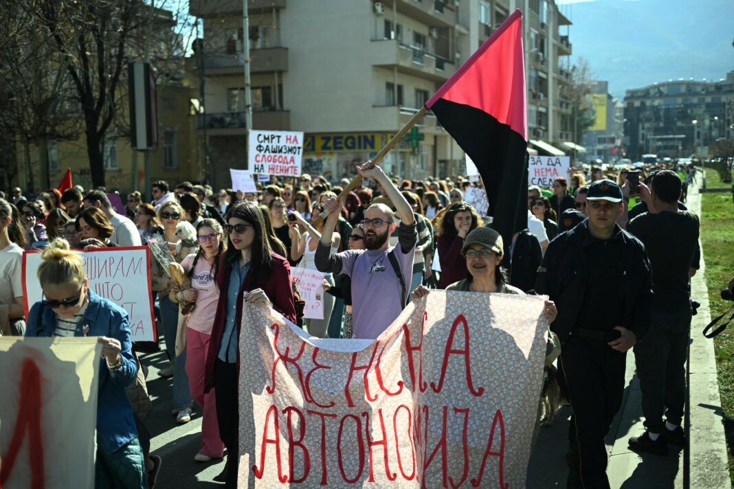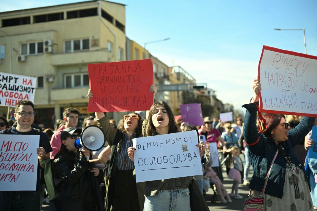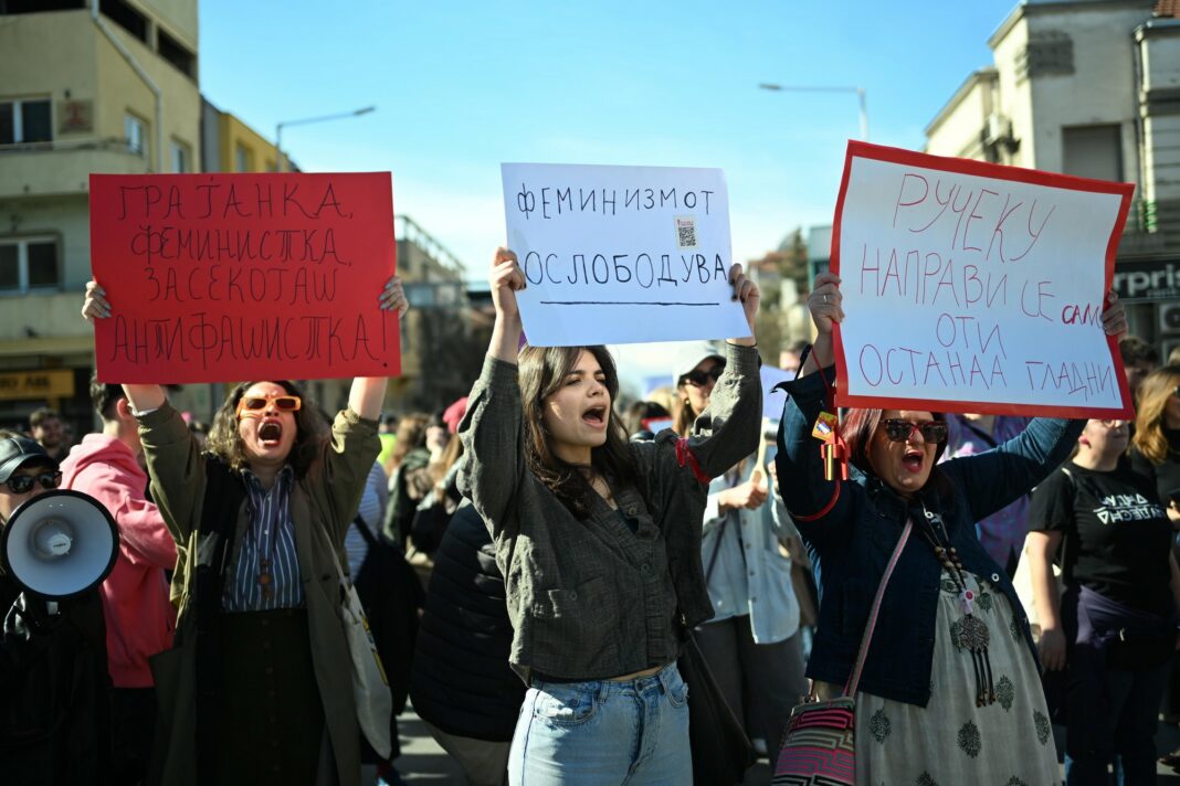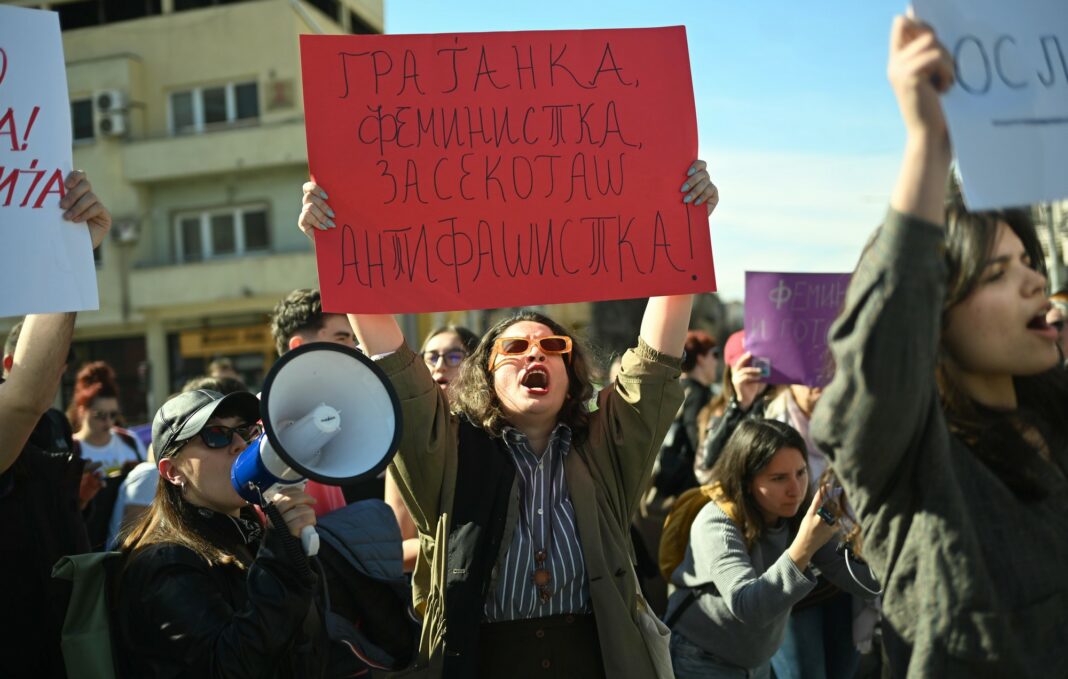 Activists from North Macedonia march under the slogan: Let them eat roses! during the International Women's Day in Skopje on March 8, 2025