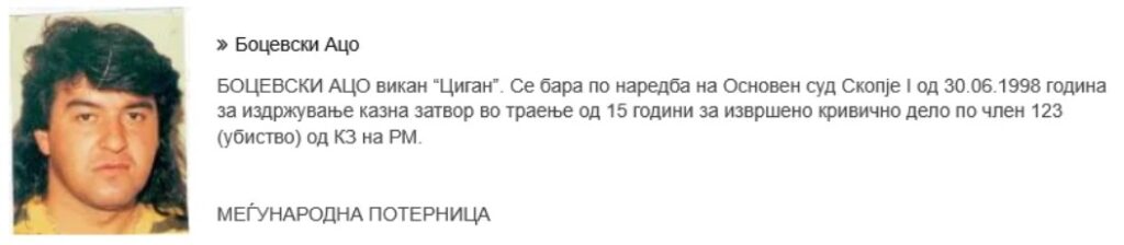 „Денеска грчката полиција извести дека го лишиле од слобода Ацо Боцевски кој беше баран со меѓународна потерница по наредба на Основен суд Скопје І од 30 јуни 1998 година за издржување казна затвор во траење од 15 години за извршено кривично дело по член 123 (убиство) од Кривичниот законик на РСМ“, соопшти утрово МВР.