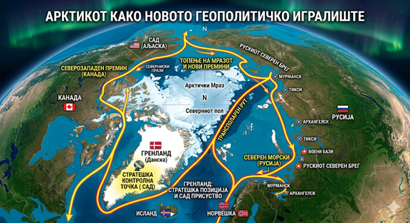 Во таа поширока пресметка се појавуваат и други навидум споредни, а всушност важни точки. Венецуела е пример за тоа како енергетиката, регионалната хегемонија и старата американска логика на Монроовата доктрина повторно излегуваат на површина. Држава што е во американскиот двор и поседува огромен нафтен потенцијал не може да биде без значење во време на енергетски потреси и глобална конкуренција. Истата логика важи и за Гренланд и поширокиот Арктик. Тоа што пред една деценија на многумина им звучеше како геополитички егзотизам, денес станува сè пореално: со топењето на мразот се отвораат нови трговски рути, пристап до суровини и нова зона за надметување меѓу големите сили. Русија веќе има искуство, база и мразокршачи. Кина сака да биде присутна како „блискоарктичка“ сила. САД не можат да дозволат ваков простор да се отвори без нивна доминантна проекција на моќ. Затоа арктичкото прашање одамна не е маргинално.