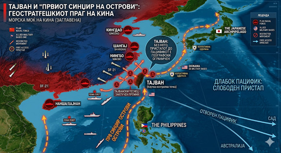 Но за Кина, Тајван не е само индустриски трофеј. Тој е геостратешки праг. Пекинг одамна ја сфатил суровата вистина дека интеграцијата во светската економија не е доволна ако нема способност за воена и технолошка автономија. Затоа Кина го разви сопствениот сателитски систем БЕИДОУ, за да не зависи целосно од американскиот GPS во клучните воени и цивилни функции. Затоа со неверојатна брзина ја гради морнарицата, од број на пловила до современи разурнувачи, подморници и носачи на авиони. И затоа Тајван добива уште поголема тежина. Додека островот останува надвор од кинеска контрола и додека првиот синџир на острови е потпрен врз американските сојузници, кинеската поморска сила нема целосно сигурен и слободен излез кон длабокиот Пацифик. Со други зборови, без решавање на тајванското прашање на начин што му одговара на Пекинг, кинеската морнарица останува делумно заклучена во простор што лесно може да биде контролиран и ограничен.