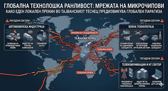 Но колку и да се важни Украина, Венецуела и Арктикот, тежиштето на идниот глобален поредок се приближува кон Индо-Пацификот, а таму најопасната точка е Тајван. Во јавноста тој најчесто се спомнува поради микрочиповите, и тоа не е погрешно. Но тоа е само површината на проблемот. Вистинската важност на Тајван лежи во спојот меѓу високата технологија, географската позиција и логиката на морската моќ. На островот со децении е граден ултраспецифичен индустриски екосистем во кој најсофистицираното производство на полупроводници не е само прашање на фабрики, туку на цела мрежа од добавувачи, хемиски процеси, инженерски знаења, прецизна работна култура и длабоко вкоренета синхронизација. Теоретски, дел од ова производство може да се пресели. Практично, тоа не се прави брзо и без огромни последици. Во свет зависен од чипови за телефони, автомобили, медицински апарати, телекомуникациска опрема, дата-центри и напредни вооружени системи, секој сериозен прекин во тајванските синџири на снабдување би имал шокови што би се почувствувале речиси веднаш и речиси насекаде.