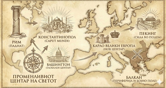 Историјата на Балканот може да се чита како циклус на поместување на центрите на моќ. По падот на западноримскиот свет, Константинопол стана цивилизациска метропола на Медитеранот; со падот на Византија, тежиштето се префрли кон Централна и Западна Европа. Оттогаш Балканот најчесто функционира како периферија — терен за препукување на регионални и глобални сили, а не како носител на агенда. Во 20-от век дуалната структура на моќ се разби, а по 1990 година, хегемонијата се консолидираше во Вашингтон. Денес, таа хегемонија е предизвикана од економскиот подем на Кина и реверзибилните амбиции на Русија, што ја враќа логиката на блокови и сфери на влијание, со сите познати ризици за мали и отворени системи како балканските држави.