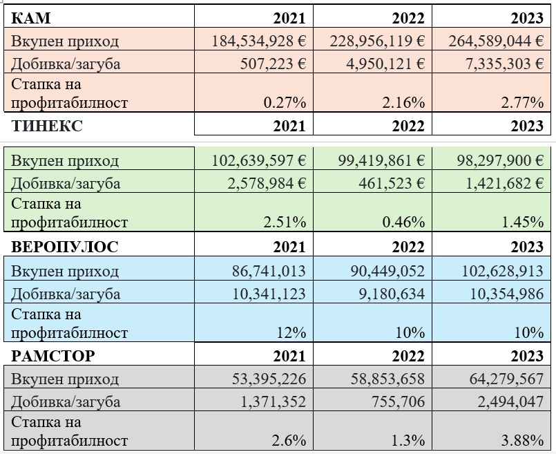 На една страна го имаме КАМ со најголем промет во трговијата од 270 мил евра и профитабилност од само 3%, а на друга – Веропулос со три пати помал промет (102 мил €) и три пати поголема профитабилност (10%).