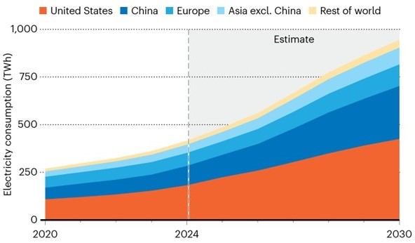 Според Меѓународнат агенција за енергија (IEA) центрите за податоци учествувале со околу 1,5% од светската потрошувачка на електрична енергија во 2024 година, или 415 TWh (терават-часови). Учеството на САД било најголемо (45%), по што следуваат Кина (25%) и Европа (15%). Потрошувачката на електрична енергија во центрите за податоци се очекува да се зголеми повеќе од двојно на околу 950 TWh до 2030 година. Ова е малку повеќе од вкупната потрошувачка на електрична енергија во Јапонија денес.