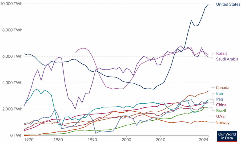 Од приложениот дијаграм се гледа дека тоа се САД кои по 2010 година станаа најголеми произведувачи на нафта и природен гас користејќи нова технологија на експлоатација на овие горива од шкрилци.