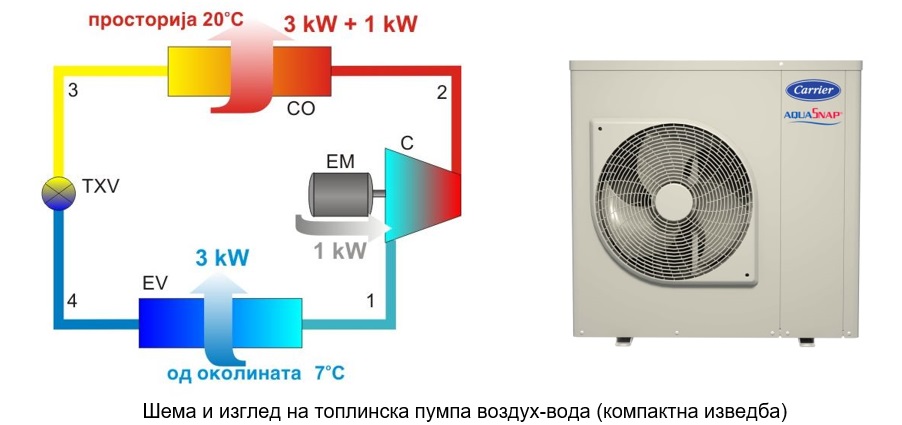 – воздух-вода (одзема топлина од околниот воздух; се предава топлина на вода за греење);