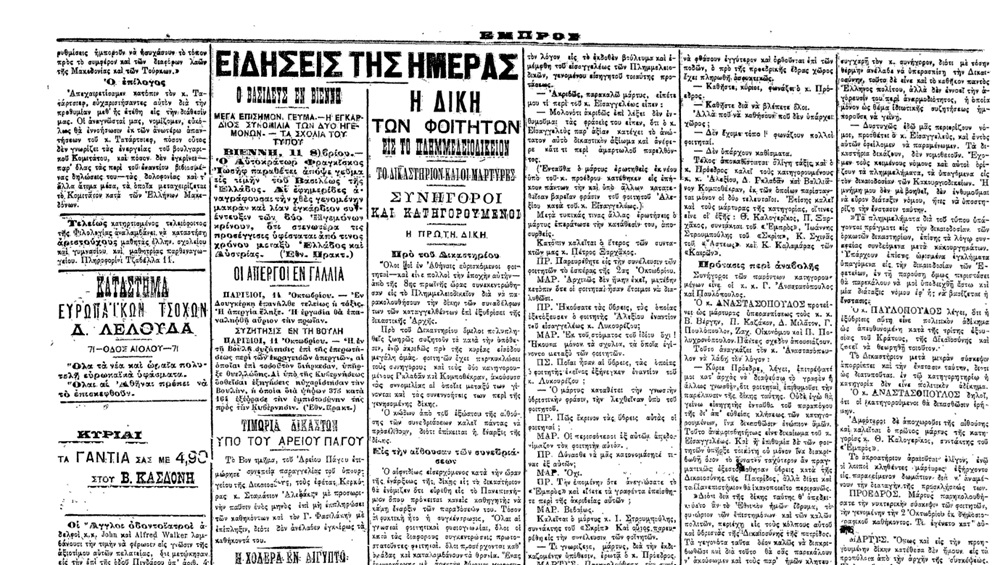 „Моите впечатоци од Атина?“ – ни рече. „Но ми се даде ли можност добро да ja видам? Се разбира, првиот мој впечаток беше добар. Кога бродот пристигна во Пиреја и видов дека за кратко време нè оставија да излеземе, без пасоши и други формалности, и го видов народот надвор слободно да се движи, слободно да разговара, да чита весници, на крајот да прави што сака, сфатив дека дишам во земја на слободата. И потоа, кога со двајца-тројца мои пријатели се искачив во Атина, се засилија моите добри впечатоци. Прекрасни згради. Добри улици. Добар народ. Добро однесување. Големо движење. Сето тоа можеше само да ме расположи благонаклоно кон вашиот град. Но не успеав да направам повеќе од една прошетка и бев одведен во полицијата“.