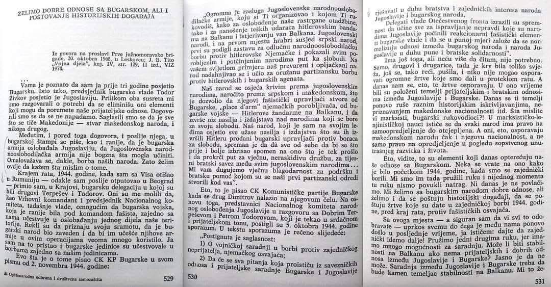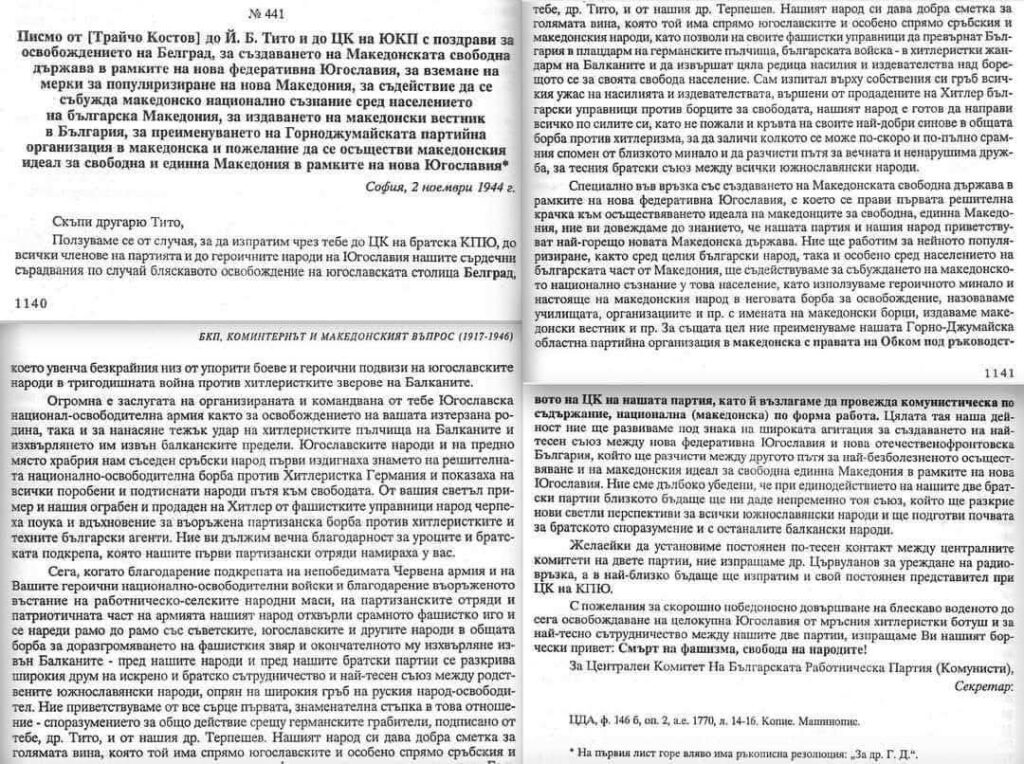 Испратеното писмо од страна на ЦК на БРП (комунисти) до Тито од 2 ноември 1944 година, кое Тито го цитира во својот говор од 1968 година (претходен скен): Главно управление на архивите при Министерския съвет “БКП, Коминтернт и Македонски’т впрос, 1917-1946“, Том 2, Софија, 1999, страници 1140-1141-1142.