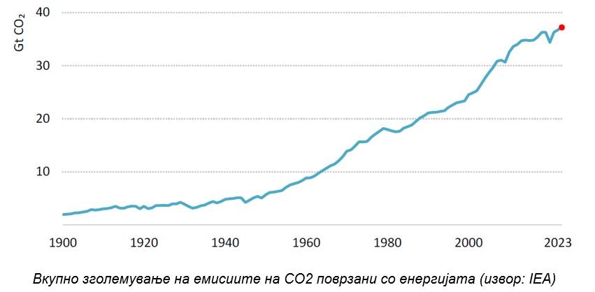 – Директен показател за фактичката состојба е дијаграмот на сликата подолу. Трендот на зголемување на емисиите на СО2 секоја година постојано се зголемува и покрај „напорите“ на меѓународните и националните тела. Во 2023 година емисиите на СО2 биле над 37 гигатони, а во 2024 ќе бидат уште поголеми.