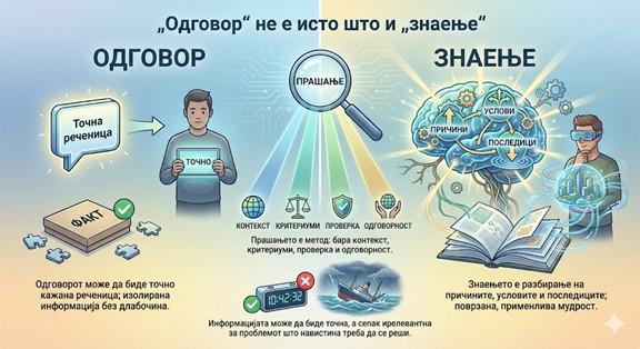 Вистинското знаење бара да знаеш што е важно, што може да се провери, кои се последиците од одлуката и каде се границите на сопственото незнаење. Ова е методологија на секојдневието за која UNESCO апелира да се градат човечки капацитети – не само техничко користење на алатките, туку нивна етичка и педагошка валидација.