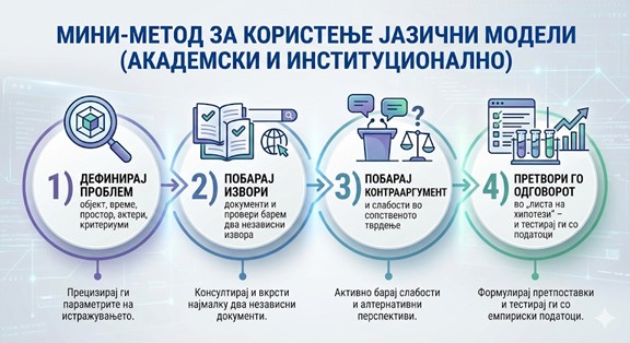 Затоа, како професор и истражувач, инсистирам на прецизност во дефинициите. Тоа што во секојдневниот говор го нарекуваме „вештачка интелигенција“, во својата сегашна форма е најчесто само моќен јазичен модел – статистичка алатка за предвидување на текст. Таа алатка може да биде извонредна за сумирање, за структурирање идеи, за генерирање нацрти. Но, таа е фабрика за текст, а не фабрика за вистина. Вистината не може да се автоматизира; таа сè уште зависи од човечките категории: метод, проверка, етика и одговорност.