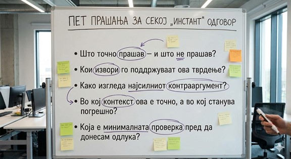Тоа значи дека глобалната дилема „дали ќе користиме алатки“ е веќе решена. Прашањето е само „како ќе ги користиме“. Ако не создадеме луѓе што умеат да прашаат, ќе имаме работна сила што знае само да копира текст, но не и да реши проблем. Во такво сценарио, конкурентноста паѓа, довербата се рони, а институциите слабеат.