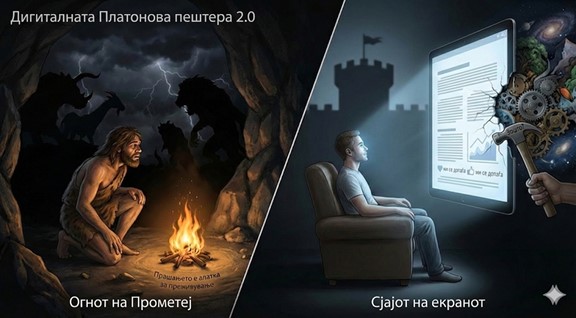 Прометејскиот момент на нашето време не е само во фактот што во рацете држиме нов „оган“. Вистинската тежина на овој момент лежи во изборот: дали тој оган ќе го користиме за осветлување на темните агли на незнаењето – или за создавање на уште поубедливи илузии на ѕидот од пештерата.