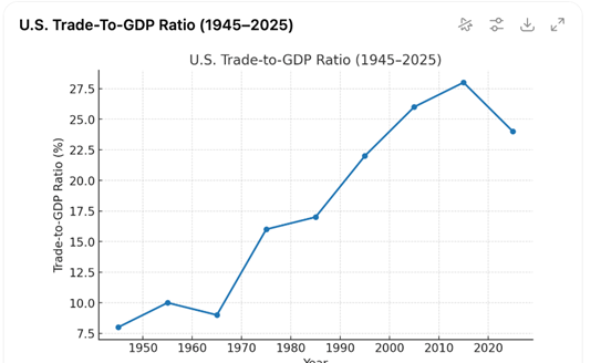 Графикон 1: Американската надворешна трговија како процент од БДП, 1945–2025