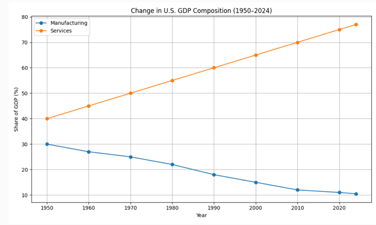 Графикон 3: Промени во структурата на американскиот БДП – производство наспрема услуги