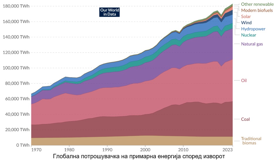 На сликата подолу е прикажана глобалната потрошувачка на примарна енергија според изворот. Може да се види дека потрошувачката на енергија во светот постојано расте. Во односот на изворите на енергија, најголемо учество во потрошувачката имаат јагленот, нафтата и природниот гас, сите тие се фосилни горива.