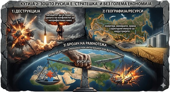 Русија останува глобален играч поради две причини: офанзивна деструктивна моќ (капацитет да ја подигне цената на конфликтот до степен на невозможна рационална пресметка) и огромна територија полна со ресурси. Русија е „географски забрзувач“ на кинеската индустриска моќ и истовремено „непремостлива пречка“ која мора да се земе предвид кога зборуваме за Евроазија.