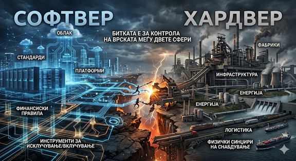 Додека Кина го гради физичкиот хардвер (мостови, пристаништа, железници, енергетски мрежи и 5G), САД ја зацврстија својата хегемонија преку софтверот и технологијата. „Облакот“ не е само техничка метафора; тој е инфраструктура на моќ. Кој ги контролира платформите, стандардите, оперативните системи, платежните мрежи и најкритичните чипови, тој ја контролира брзината и насоката на глобалната економија.