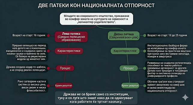 Вториот приоритет е да се напушти илузијата дека проблемите на безбедносниот сектор може да се решаваат со враќање на средно полициско образование како носталгичен одговор на современи кризи. Тоа е погрешен правец, затоа што рано професионално калапи деца, отвора етички и финансиски дилеми и се темели на логика што повеќе не одговара на времето во кое живееме. Затоа изборот треба да биде јасен: не средно полициско образование, туку задолжителен и современ воен рок. Не како ретроградно враќање назад, туку како најисплатлива инвестиција во човечки капитал, во институционална функционалност и во држава што знае да опстои кога ќе дојде кризата. На крајот, работата е прилично јасна: држава не се брани само со институции, туку и со луѓе што знаат како да се однесуваат кога работите ќе тргнат наопаку.