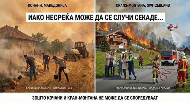 Во деновите по трагедијата во швајцарскиот алпски ресорт Кран‑Монтана, јавноста (кај нас и пошироко) повторно посегна по рефлексната формула: „исто како Кочани“. Но токму тука почнува проблемот. Да – пожар, паника, млади жртви, стотина повредени. Да – и таму и тука болката е неподнослива. Но аналитички, Кочани („Пулс“) и Кран‑Монтана („Le Constellation“) не се споредливи како „исти трагедии“, затоа што се случија во две различни системски архитектури: едната претпоставува функционален, мултидимензионален систем за заштита и спасување и дисциплинирано кризно комуницирање; другата соголи системски слабости (превенција, безбедносни стандарди, капацитети, координација) и ја потврди потребата од надворешна поддршка.