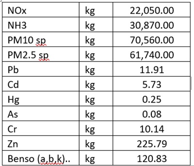 За да биде појасно, прикажани се резултати (специфични вредности според EMEP/EEA) при следни претпоставки: едно домаќинство троши 5 m3 дрво за огрев, а резултатите се однесуваат за 10 илјади домаќинства: