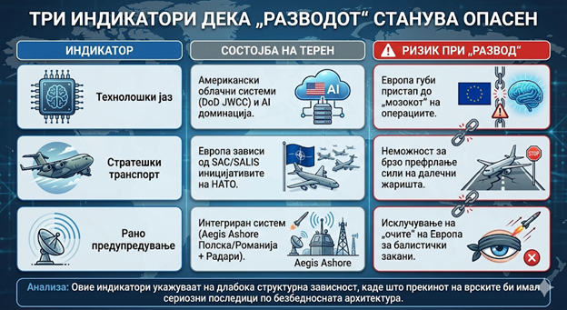 Разводот меѓу САД и НАТО би бил како на Европа да ѝ го исклучиш GPS сигналот и рутерот за интернет. Затоа, европската стратегија EDIS е всушност „анти-развод документ“ и претставвува обид Европа да стане помалку зависна, но истовремено е признание дека без САД, мрежата е кревка.