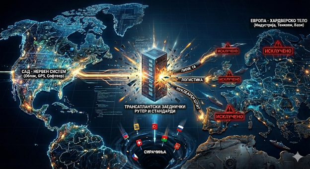 Но, кога заедничкиот непријател се менува, а интересите почнуваат да се разидуваат, на површина излегува суштината: сојузништвото не е романса – тоа е инфраструктура. И тука е главната теза: „разводот“ САД–Европа би бил катаклизмичен не затоа што би снемало симпатии, туку затоа што би се разнишале стандарди, мрежи, командни системи, логистика и разузнавачки капацитети. Тоа е сето она што денес го земаме здраво за готово.