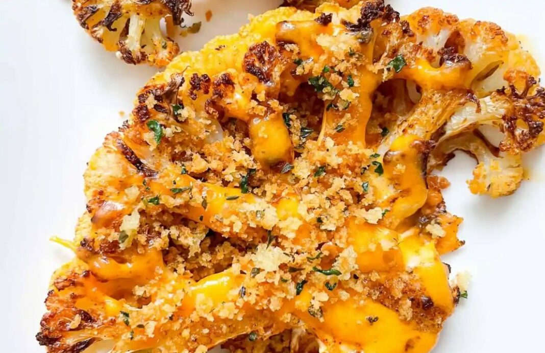 Премачкајте со четка од смесата врз стековите од карфиол (само од едната страна), одозгора наредете рендан чедар кашкавал и печете 15 минути, додека кашкавалот да порумени.