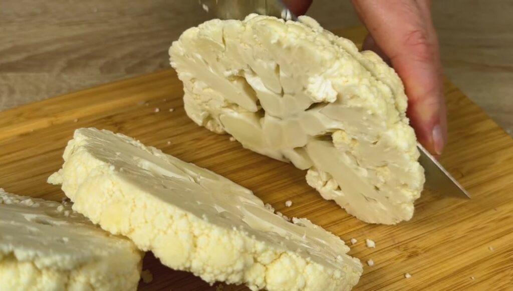 Измијте го карфиолот и отстранете ги сите вишок листови. Исечете го карфиолот на „стекови“ како на сликата и пржете ги во тавата додека да поруменат и омекнат.