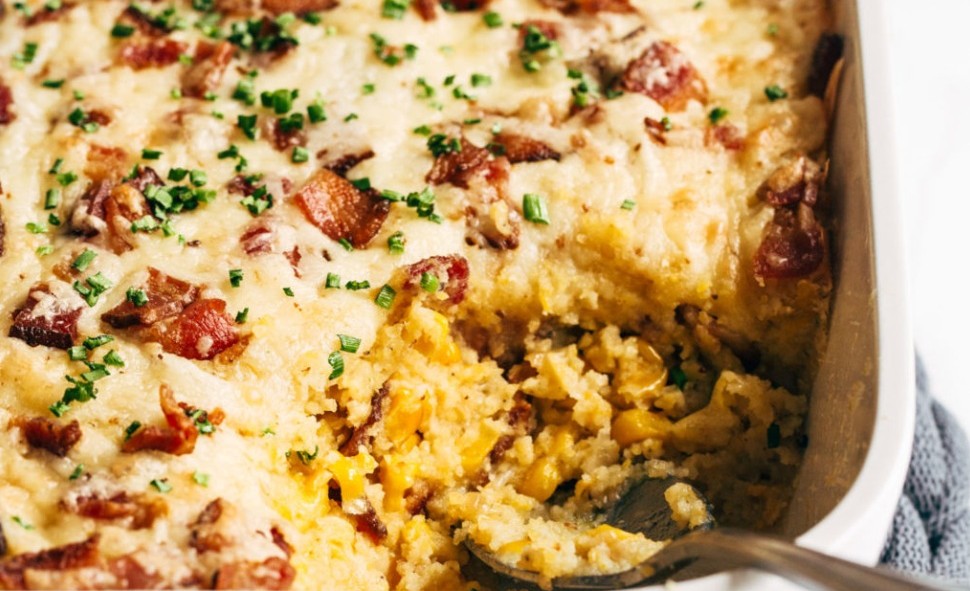 Во сад, измешајте ги пченкарното брашно, брашното, шеќерот, прашокот за печиво и солта. Во посебен сад, изматете ги павлаката, путерот и јајцето додека не добиете мазна смеса. Потоа додајте ги пченката, изблендираната пченка, смесата од кромид и половина од сланината. Додадете ги сувите состојки и мешајте додека не се соединат.