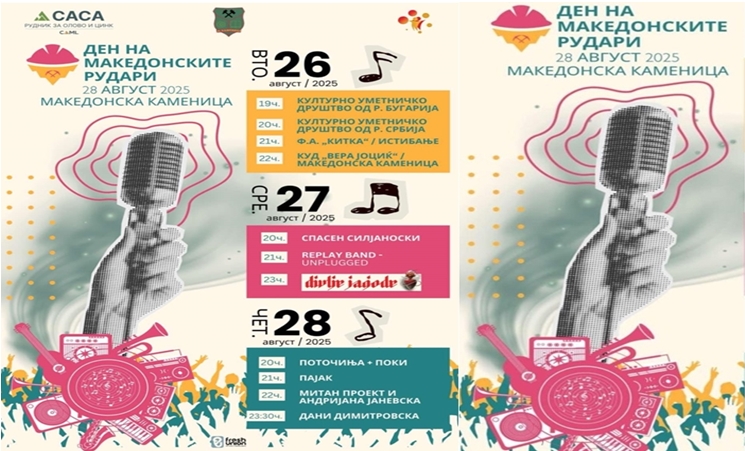 На Денот на рударите (четврток, 28 август) во 20 часот вечерта ќе ја отворат најмладите – хорот „Поточиња“ и нивниот Поки. Забавата потоа продолжува со ДЈ Пајак, Митан проект и Андијана Јаневска – совршен спој на традиција и современост, рокерката Дани Димитровска, чиј моќен вокал ќе биде вистинска круна на прославата.
