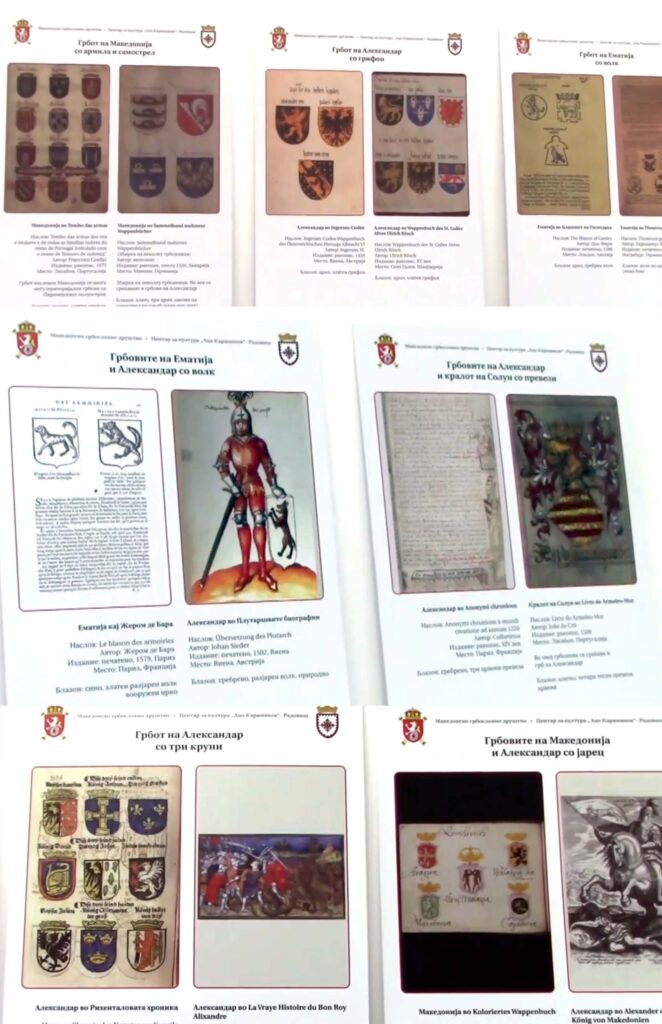 Беа претставени грбовите на Македонија од европските и илирските грбовници, грбовите на кралот на Античка Македонија, припишаниот на Александар Трети Македонски и на митскиот предок Македон од Ематија…