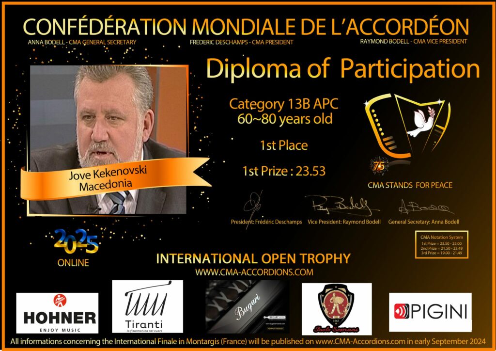 Светската конфедерација на акордeонот (Confédération Mondiale de l’Accordéon – СМА) создадена во 1951 година, секоја година организира Светскиот трофеј (Trophée Mondial) во различна земја. Ова натпреварување од највисоко меѓународно ниво обединува повеќе од 60 национални делегации од сите континенти. Светскиот трофеј на СМА досега се одржал 73 пати.