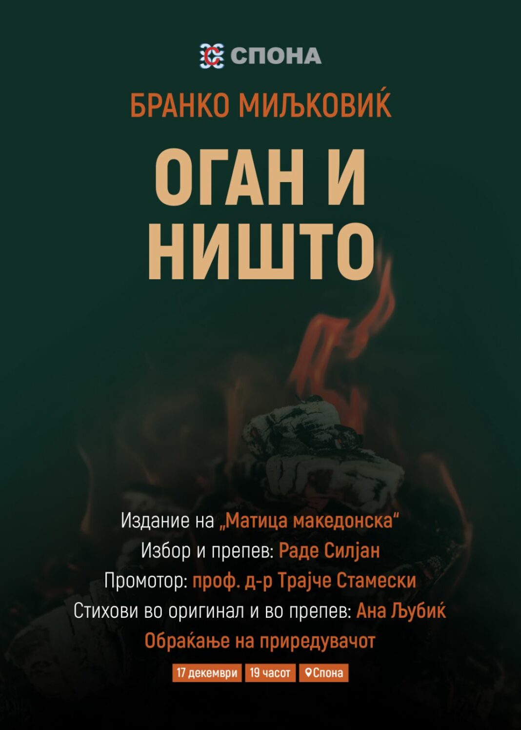 Промотор на изданието ќе биде проф. д-р Трајче Стамески од Филолошкиот факултет „Блаже Конески“ при Универзитетот „Св. Кирил и Методиј“ во Скопје, а стиховите на Миљковиќ, во оригинал и во препев на македонски јазик ќе ги интерпретира Ана Љубиќ. Пред присутните, за делото на Миљковиќ ќе се обрати и приредувачот на изборот и препејувач, Раде Силјан.