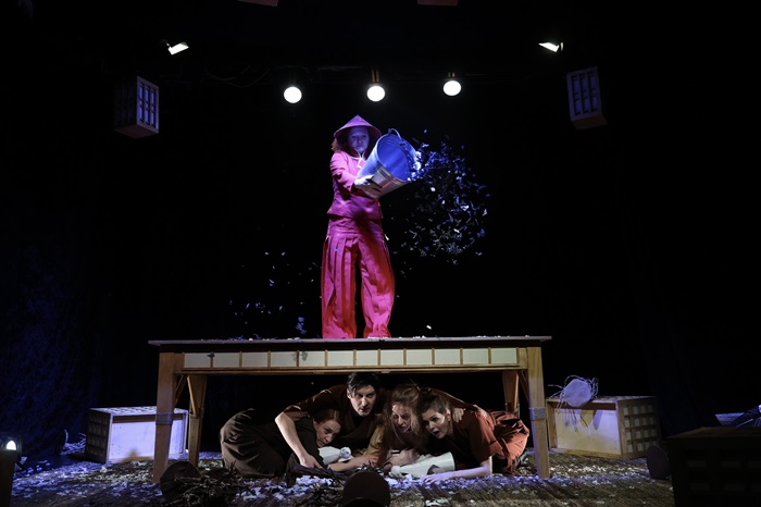 Во претставата настапуваат: Анастасија Ласовска во улогата на Садако, Никола Наковски како Шигео, Ана Левајковиќ-Бошков во улогата на мајката, Катарина Илиевска-Силјановска како таткото, Изабела Новотни во улогата на бабата и Марија Ѓорѓијовска во улогите Господин Војна/Госпоѓа Леукемија.