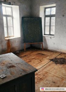 „Пешачејќи низ селото Војница здогледавме една стара градба која наликуваше на напуштено училиште. Од предниот прозорец ѕиркаше портрет на Тито и најавуваше дека внатре сѐ уште има остатоци од некое друго време. Вратата скоро подотворена, само една тенка жичка околу кваката ја спречуваше под силата на ветерот да биде ширум отворена. Решивме да влеземе…“, вака ја започна тој својата сторија која ја објави на Инстаграм и која е повод за пишувањето на МКД.мк.