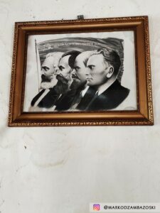 „Во првата просторија, во ќошот, стоеја неколку географски карти на Југославија, излитен глобус и математичко сметало. Втората просторија беше празна, освен онаа веќе спомената слика од Тито кој гледаше кон групна слика од Маркс, Енгелс, Ленин и уште еднаш – Тито.