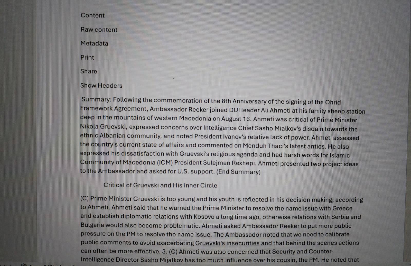 „По одбележувањето на 8-годишнината од потпишувањето на Охридскиот рамковен договор, амбасадорот Рикер му се придружи на лидерот на ДУИ, Али Ахмети, на неговата семејна фарма за овци длабоко во планините на западна Македонија на 16 август. Ахмети беше критичен кон премиерот Никола Груевски, изрази загриженост во врска со презирот на шефот на разузнавањето, Сашо Мијалков кон етничката албанска заедница и го забележа релативниот недостаток на моќ на претседателот Иванов. Ахмети ја оцени моменталната состојба во земјата и ги коментираше најновите лудории на Мендух Тачи. Тој, исто така, го изрази своето незадоволство од религиозната агенда на Груевски и имаше остри зборови за претседателот на Исламската верска заедница на Македонија (ИВЗ), Сулејман Реџепи. Ахмети му презентираше на амбасадорот две проектни идеи и побара поддршка од САД“, се наведува во резимето на телеграмата на Рикер.