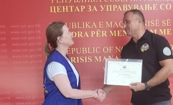 Денеска Ангелов на Клер Ковалески, офицер за врска од ЕУ механизмот за цивилна заштита ѝ врачи пригодно признание за нејзината работа, соработка и координација со и преку ЦУК од 2 до 5 август, со Европската Унија и противпожарните сили кои дојдоа да помогнат од другите европски земји.