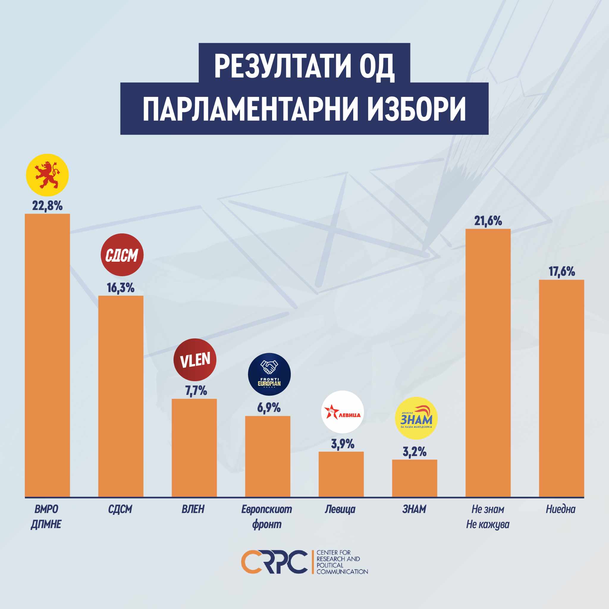 Што се однесува до претседателски избори анкетата на ЦРПЦ покажува дека кандидатот од ВМРО ДПМНЕ Гордана Сиљановска Давкова води пред конкурентот, актуелниот претседател и кандидат за втор мандат, Стево Пендаровски поддржан од СДСМ, а Арбен Таравари од коалицијата Вреди и Бујар Османи од Европскиот фронт предводен од ДУИ се во тесна трка.
