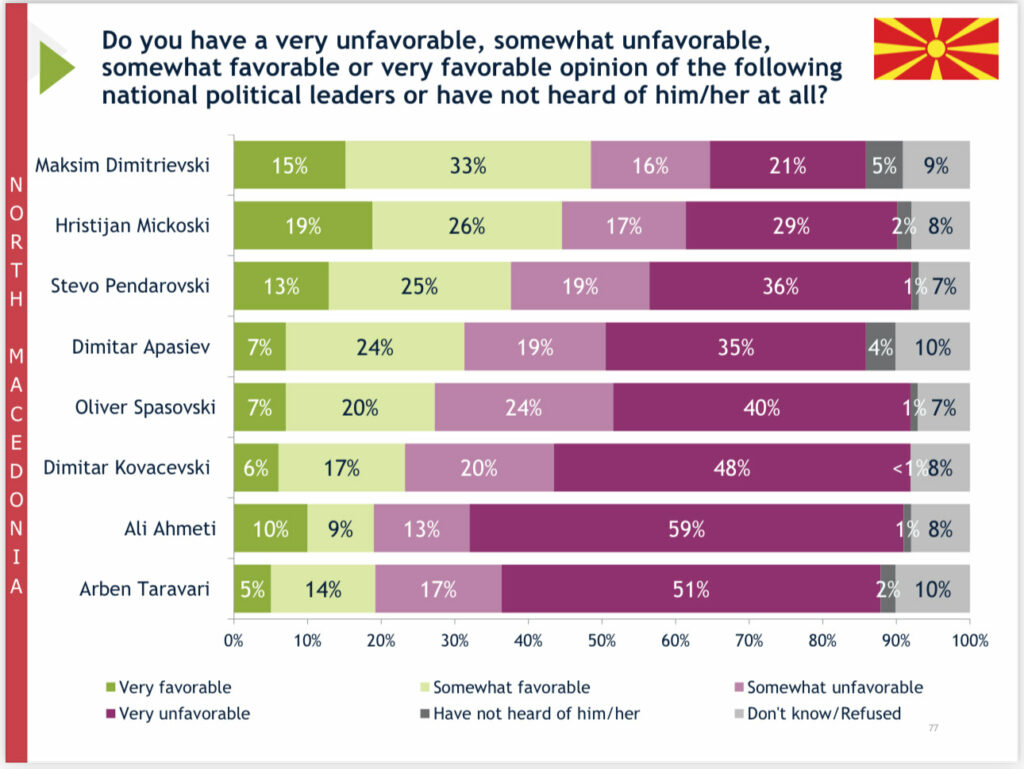 Од податоците изнесени во анкетата може да се заклучи дека најнеомилен политичар во Македонија е Али Ахмети за кого 72 посто од испитаниците рекле дека имаат негативно или многу негативно мислење за него, додека за Арбен Таравари 68 посто рекле дека имаат негативно или многу негативно мислење, исто како и за Димитар Ковачевски.