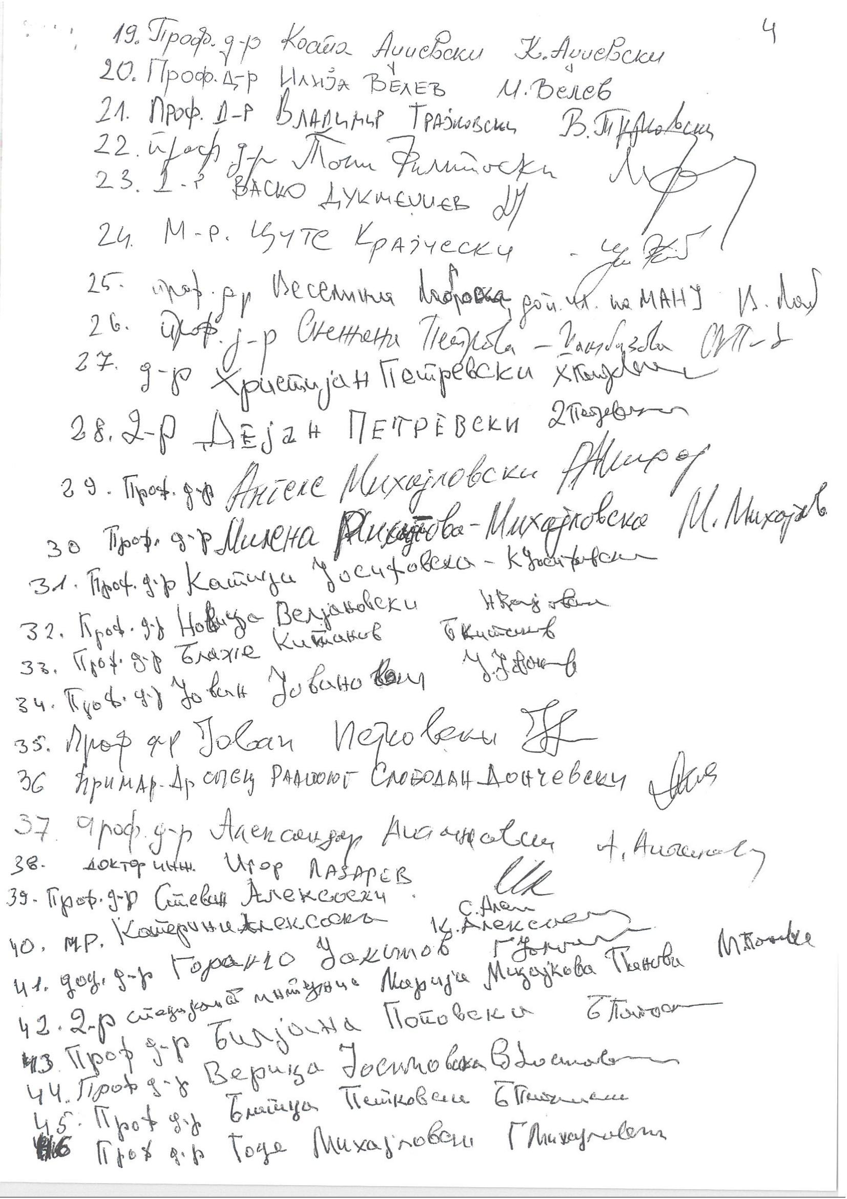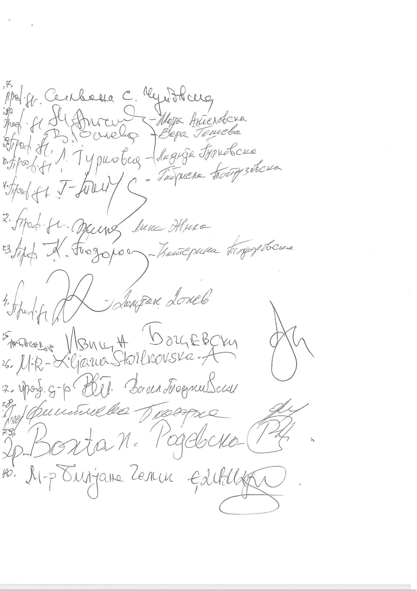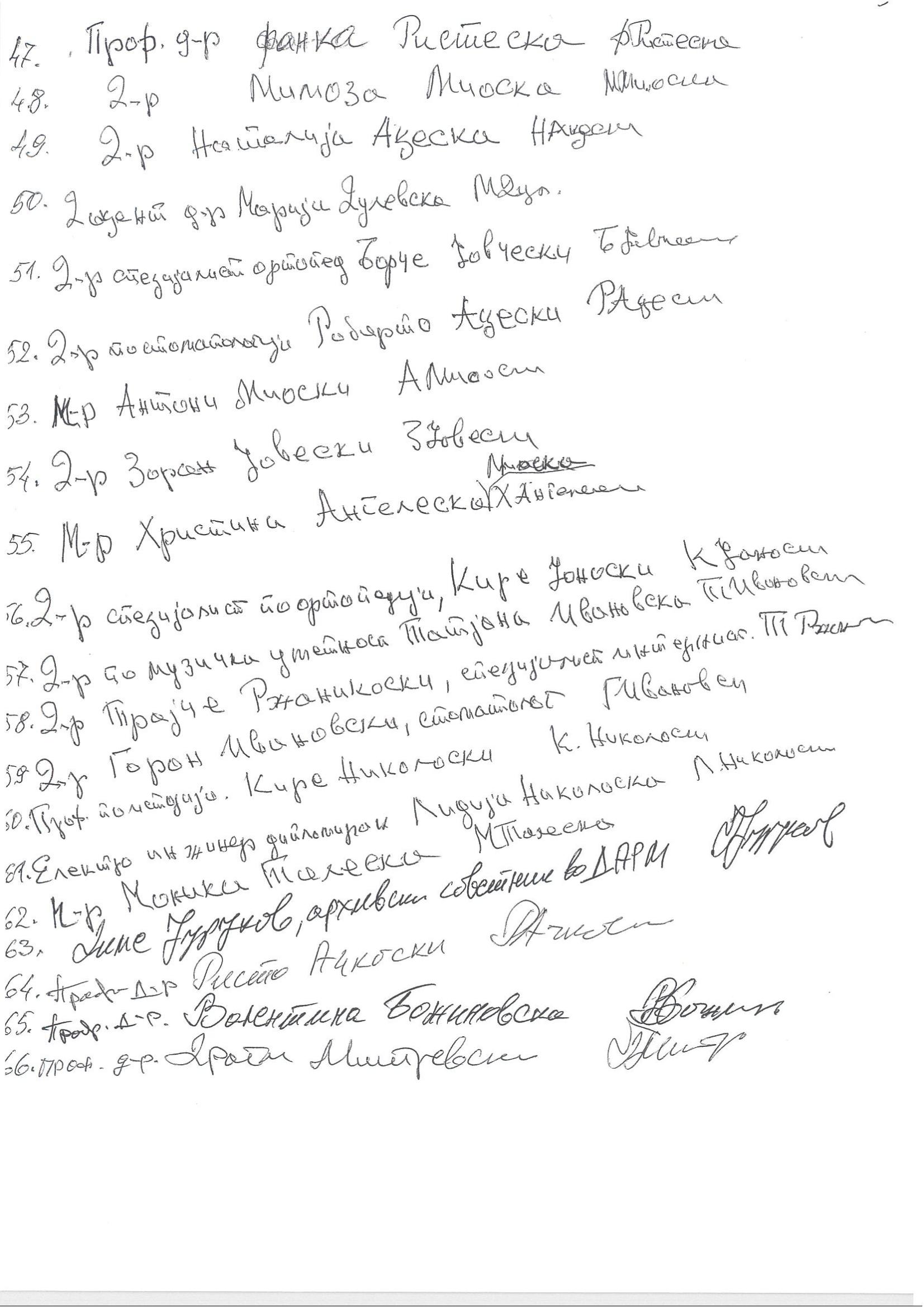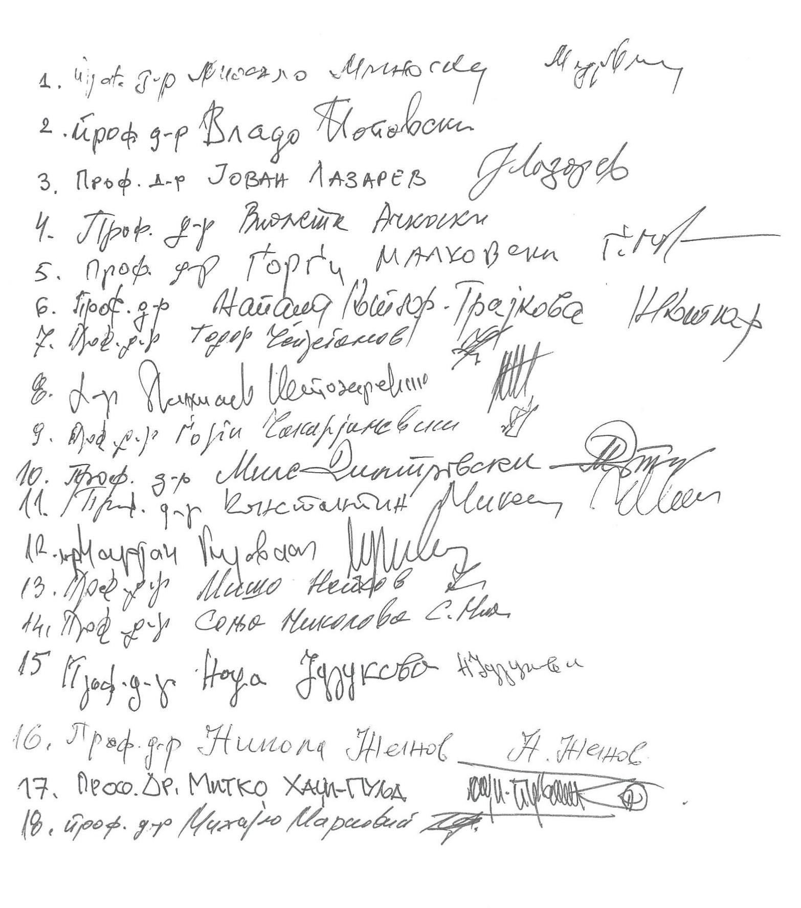 На писмото, меѓу другите се потпишани и Михајло Миновски, Владо Поповски, Јован Лазарев, Виолета Ачковска, Тодор Чепреганов, Наташа Котлар, Миле Димитровски, Ѓорги Малковски, Митко Хаџи Пуља, Мишо Нетков, Нада Јурукова, Никола Жежов, Новица Велјановски, Ивица Боцевски…