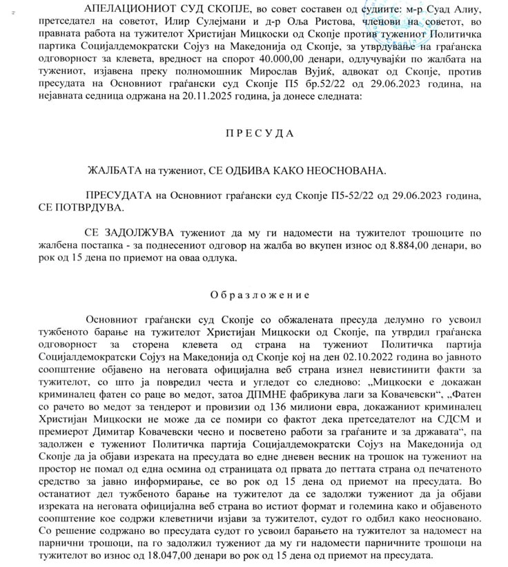 Жалбата на тужениот СДСМ, е одбиена како неоснована од страна Апелацискиот суд, до што е потврдена пресудата од 2023 година. Пресудата се однесува на тужбата за клевета, од страна на Христијан Мицкоски, дека СДСМ изнел невистинити факти за него, нарекувајќи го „докажан криминалец фатен со рацете во медот“, со што ги повредил неговите углед и чест.