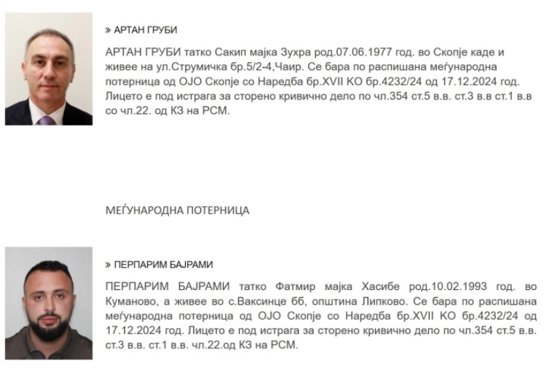 Вчера Јавното обвинителство издаде наредба до Министерството за внатрешни работи (МВР) да распише потерница за поранешниот вицепремиер Артан Груби и ексдиректорот на Државна лотарија, Перпарим Бајрами откако Основниот кривичен суд Скопје одлучи да им изрече мерка притвор во траење од 30 дена затоа што и двајцата се наоѓаат во Косово.