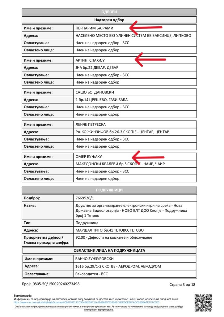„Како носител на дејноста и косопственик на Ново ВЛТ се јавува компанијата Друштво за услуги ХТЛ Македонија ДООЕЛ Скопје. За членови на Надзорниот Одбор на Ново ВЛТ беа назначени, продолжената рака на Артан Груби и поранешниот директор на АД Државна Лотарија, Перпарим Бајрами и неговите сопартијци од ДУИ, Артин Спахију и Омер Буњаку. Согласно оваа рамковна спогодба – Договор за јавна набавка склучена меѓу Ново ВЛТ и косопственикот и основачот ХТЛ, склучена на 13 јуни 2024 или 35 дена после парламентарните избори, се предвидува за период од две години да се набават 1.600 видео лотариски терминали во вкупна вредност од речиси 19 милиони евра.